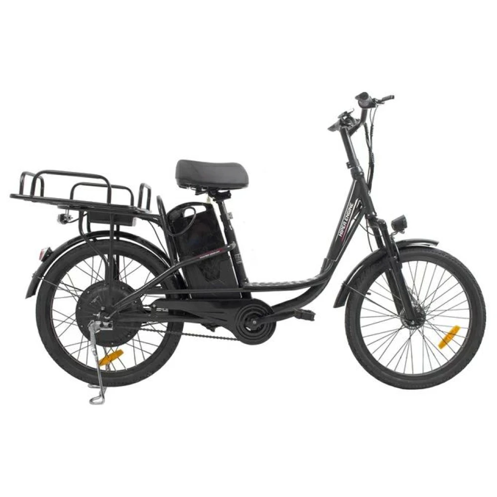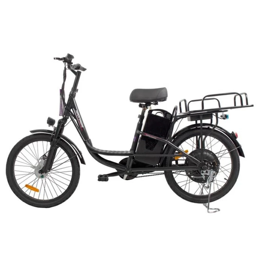 При максимальной грузоподъемности 130 кг и параметрах электродвижка 350 Вт скоростные параметры достигают 25 км/час, а максимальный запас хода составляет 45 км. Батарея емкостью 12 А*ч размещена за подседельной трубке в специальном защитном блоке. АКБ быстро заряжается, относится к категории быстро съемных элементов.