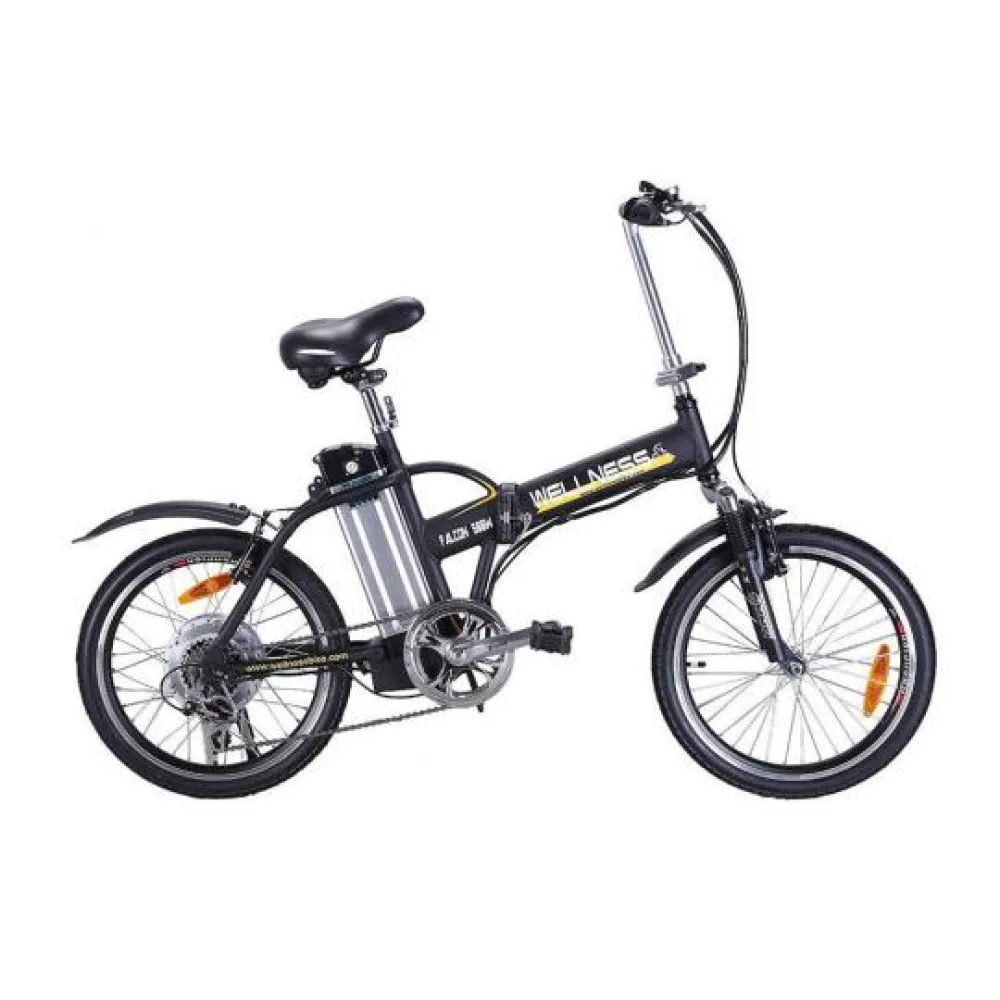 Оснащение электровелосипеда Wellness FALCON состоит из двигателя мощностью 500 Вт, литий-ионного аккумулятора емкостью 12 А*ч. Его легко отсоединить для зарядки. Полного заряда батареи хватает на 40-45 км пути, в зависимости от скоростного режима и нагрузки. Пополнить заряд аккумулятора можно за 8 часов, подключив зарядное устройство. Оно идет в комплекте с электровелосипедом. Максимальная скорость, развиваемая транспортным средством 40 км/ч. Колеса диаметром 20 дюймов. Ободная тормозная система позволяет уверено управлять агрегатом. Амортизация передней вилки смягчает ход.